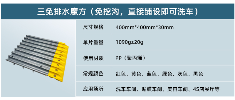 1、免挖溝,直接鋪設(shè)即可洗車。     2、免清淤,泥沙順自有排水溝直接排走。     3、免防水,接口處打防水膠后徹底防漏水。
