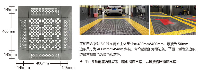 1. 分為3.4.5.厚度,解決不同厚度,統(tǒng)一紋路的問題 2. 啞光平紋設(shè)計(jì),防滑,美觀,易清潔 3. 選用高級原料,加入其他輔料,顏色亮麗,無異味,無污染 4. 顏色為紅黃藍(lán)綠黑灰六色,滿足客戶用色需求,搭配屬于自己的風(fēng)格 5. 通扣鎖扣設(shè)計(jì),容易鋪設(shè)且容易拆卸打理 6. 加強(qiáng)支撐,不容易出現(xiàn)壓壞壓斷現(xiàn)象,滿足大多數(shù)車輛施工的要求 7. 使用年限長,五年超長質(zhì)保,使用無后顧之憂 8. 十字支撐,保證承載最大化的同時(shí),且易排泥排水