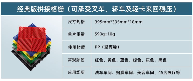 一套完整的拼接格柵產(chǎn)品由主體格柵、公邊條、母邊條、轉(zhuǎn)角四部分構(gòu)成,主體格柵的尺寸為395mm*395mm*18mm,厚度為18mm,邊條尺寸為400mm*60mm*8mm,轉(zhuǎn)角為扇形結(jié)構(gòu),尺寸規(guī)格為60mm*60mm*18mm。 拼接格柵通過(guò)一個(gè)簡(jiǎn)便互鎖接口設(shè)計(jì),重量輕,可拆卸,易于安裝。無(wú)需使用工具,即可快速構(gòu)建起堅(jiān)實(shí)的展示地板地面。 拼接格柵重量輕、結(jié)構(gòu)緊湊,便于運(yùn)輸或儲(chǔ)存?蓮V泛用作汽車4S店展臺(tái)地板、汽車美容店地面、汽車貼膜車間、美容車間以及客戶休息室等場(chǎng)所,同時(shí)也適用于展覽、展會(huì)等臨時(shí)性場(chǎng)所的地面鋪設(shè)。在幾乎所有有水的場(chǎng)所拼接格柵都能使用。