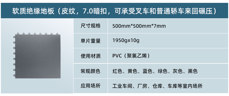 軟質(zhì)絕緣地板采用純新軟性PVC(聚氯乙烯)生產(chǎn)而成,具有防滑、防油、靜音、抗沖擊、高承載等特點,可以快捷安裝在任何現(xiàn)有的基板,包括木材,混凝土,環(huán)氧樹脂,瓷磚,水磨石等,廣泛應(yīng)用于車間廠房地面、倉庫地面、車庫地面、健身房、展廳等場所。