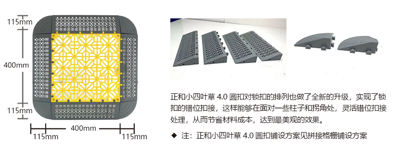 正和小四葉草4.0圓扣采用通扣設(shè)計(jì),可以確保產(chǎn)品鋪設(shè)完成后在任何區(qū)域單獨(dú)取出,極大的方便了客戶后期局部清理泥沙等,給店面的日常衛(wèi)生維護(hù)提供了很好的基礎(chǔ)。